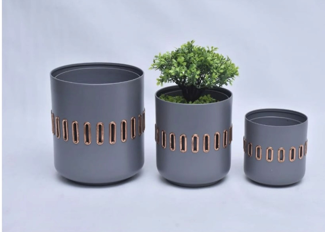 Handcrafted Metal Planter Set – Matte Grey with Copper Detail