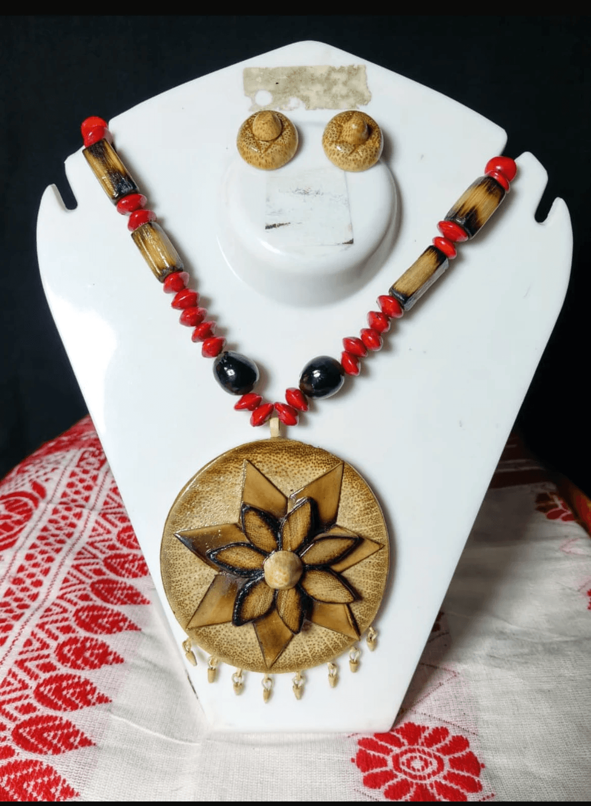 This elegant handcrafted jewellery set features a bold statement necklace paired with matching stud earrings, inspired by traditional Indian craftsmanship and earthy aesthetics.