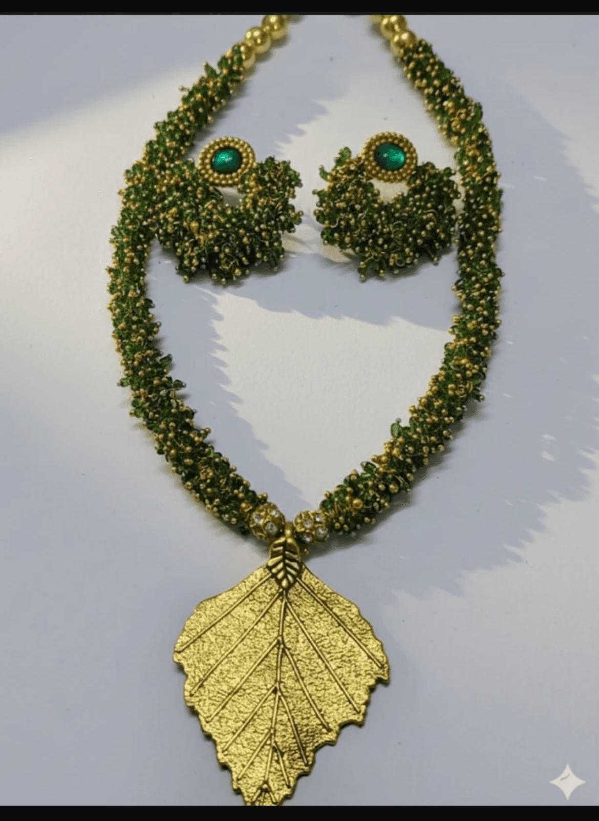 This vibrant handcrafted jewellery set features a beautifully designed necklace paired with matching earrings, showcasing a lively blend of traditional Indian artistry and contemporary ethnic style.
